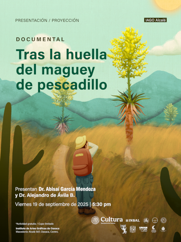 Tras la huella del maguey de pescadillo Cultural Presentacion Presentación y proyección del documental 17:30 - 17:30 horas 19 de septiembre de 2025 Instituto de Artes Gráficas de Oaxaca Actividad gratuita