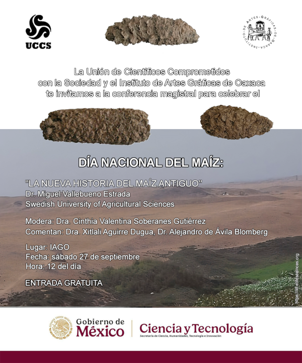 Día nacional del maíz Conferencia Conferencia "La nueva historia del maíz antiguo" impartida por el Dr. Miguel Vallebueno Estrada, Swedish University of Agricultural Sciences. 12:00 - 14:00 horas 27 de septiembre de 2025 Instituto de Artes Gráficas (IAGO) Actividad gratuita