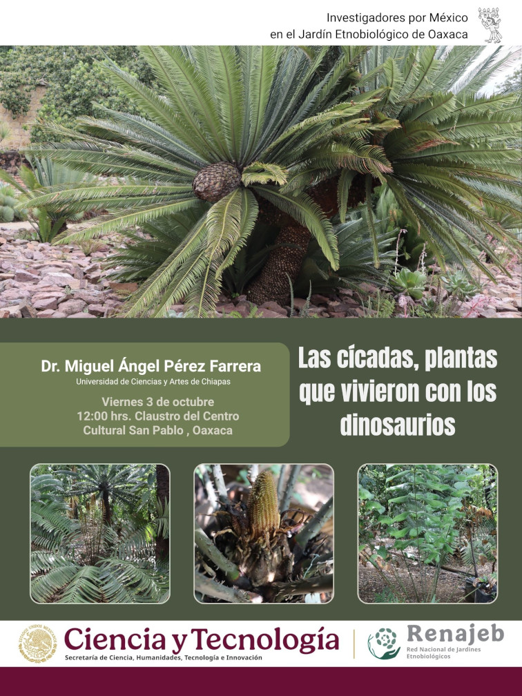 Las cícadas, plantas que vivieron con los dinosaurios Conferencia Conferencia del Dr. Miguel Ángel Pérez Farrera, investigador de la Universidad de Ciencias y Artes de Chiapas 12:00 - 14:00 horas 03 de octubre Claustro del Centro Cultural San Pablo, Oaxaca Actividad gratuita