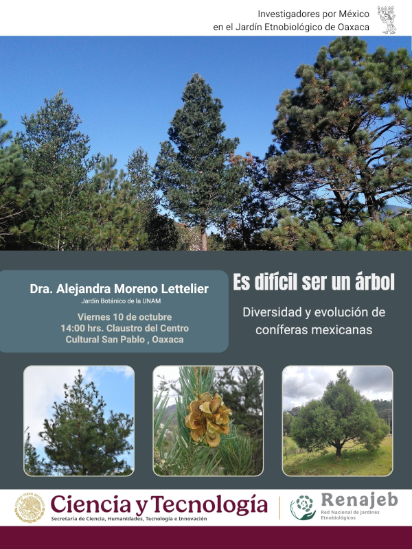 Es difícil ser un árbol. Diversidad y evolución de coníferas mexicanas Conferencia Conferencia impartida por la Dra. Alejandra Moreno Letelier, investigadora del Jardín Botánico de la UNAM 14:00 - 16:00 horas 10 de octubre Claustro del Centro Cultural San Pablo, Oaxaca Actividad gratuita